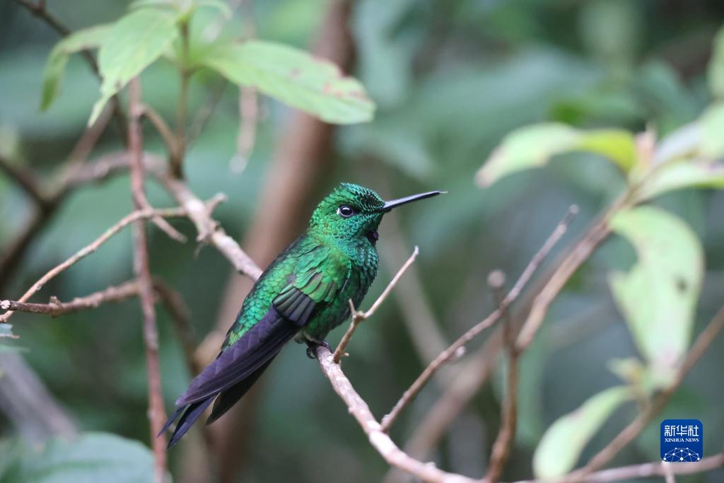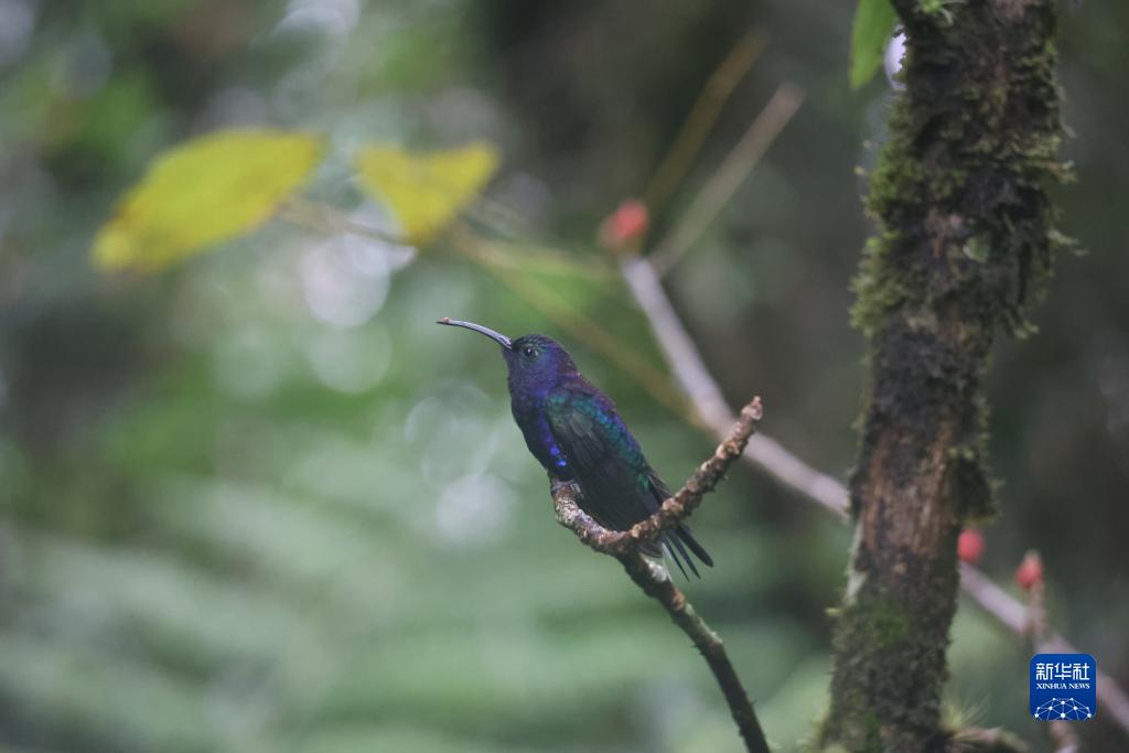 7月24日,哥斯达黎加蒙特韦德云雾森林生物保护区的一只紫刀翅蜂鸟停在林中。新华社记者 范小林 摄