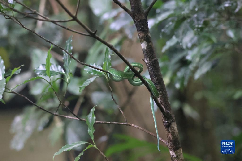 7月24日,在哥斯达黎加蒙特韦德云雾森林生物保护区内,一条侧带棕榈蝮蛇缠绕在树枝上。新华社记者 范小林 摄