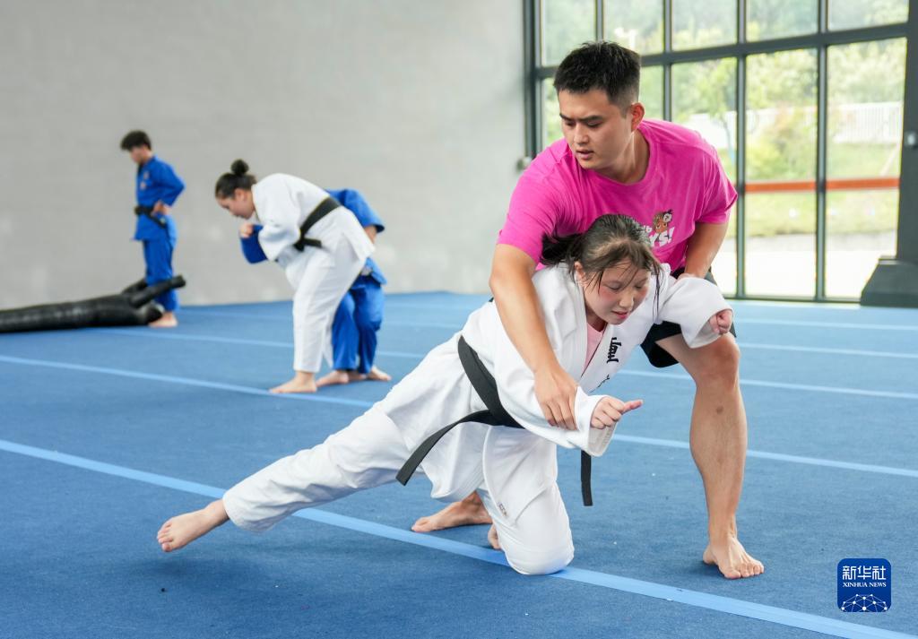 8月4日,重庆市特殊教育中心柔道队队员在教练刘祖宇(右一)指导下进行训练。
