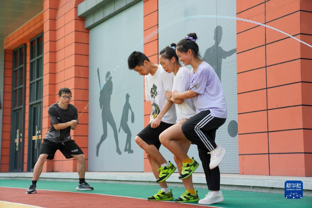 8月4日,重庆市特殊教育中心跳绳队队员在进行多人团体跳绳训练。