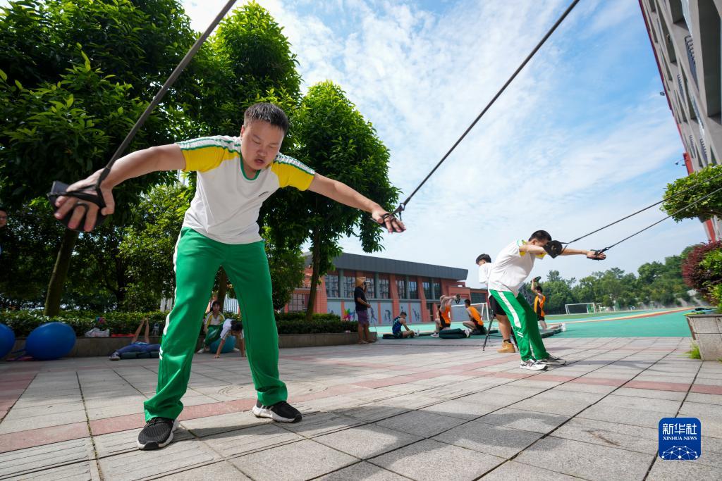 8月4日,重庆市特殊教育中心游泳队队员谢长江(左一)和队友们一起在学校操场进行游泳基本动作练习。