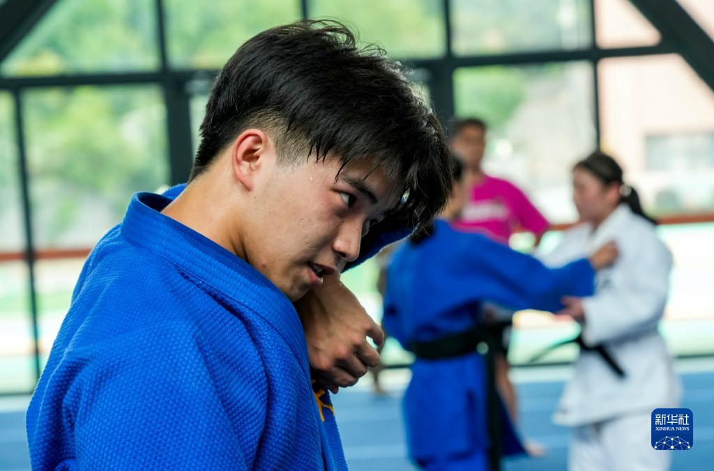 8月4日,重庆市特殊教育中心柔道队队员周涵训练间隙擦汗。
