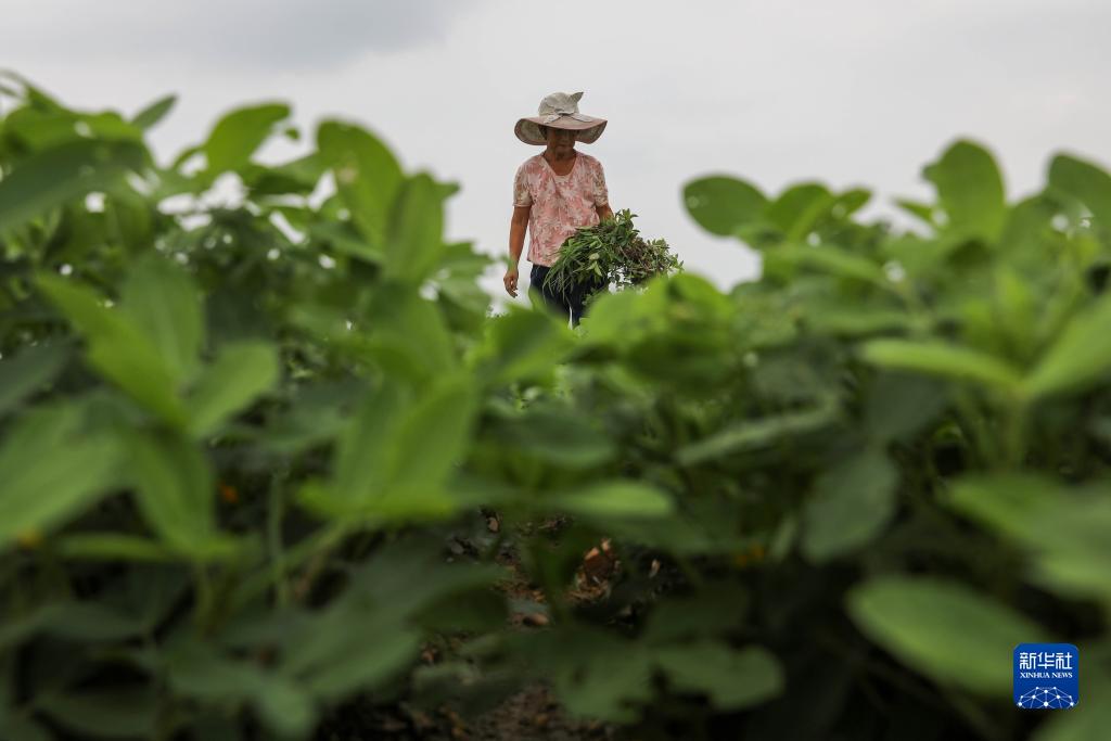 8月7日,在河南省宝丰县张八桥镇东火山村一处花生地,农民在田间除草。