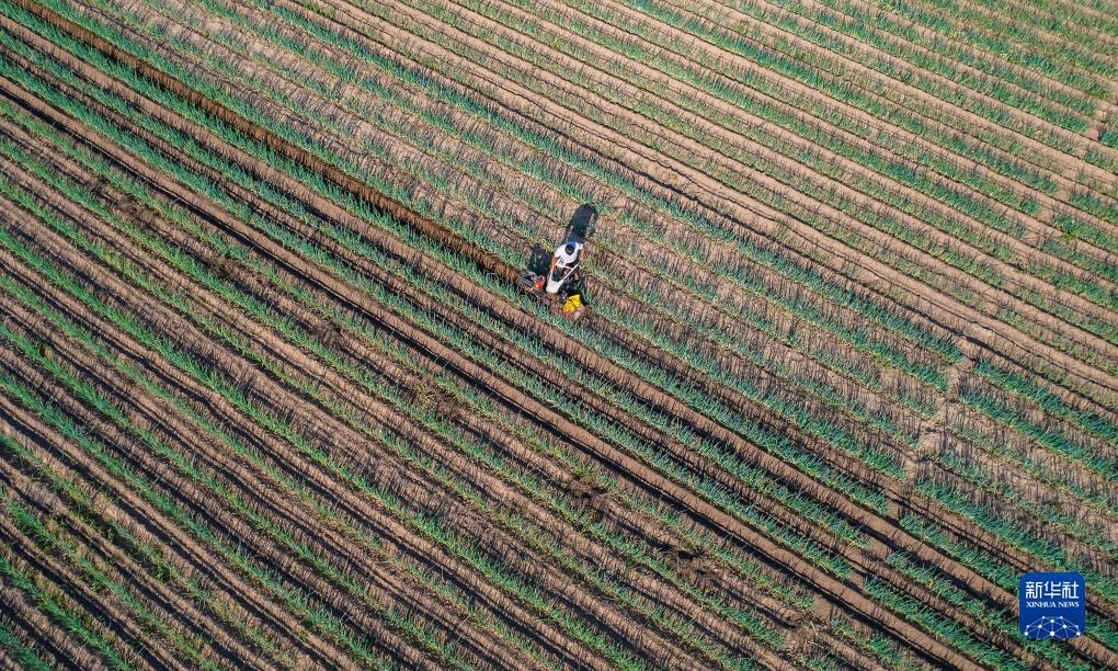 8月7日,河南省夏邑县会亭镇王厂村农民在给大葱封沟(无人机照片)。