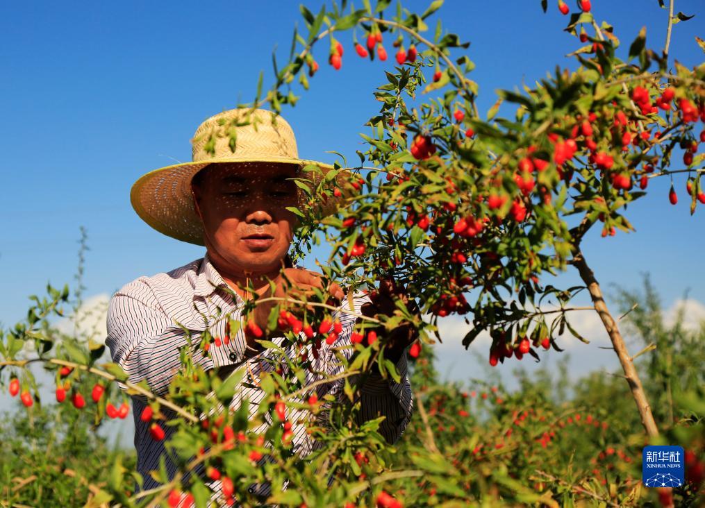 8月6日,在甘肃省张掖市甘州区安阳乡苗家堡村枸杞基地,村民在采摘枸杞。