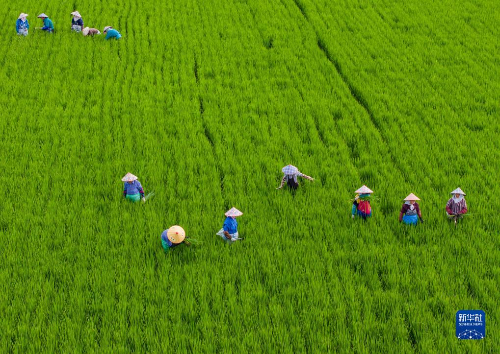 8月7日,在江苏省昆山市陆家未来智慧田园现代农业园区,村民在水稻田清除杂草(无人机照片)。