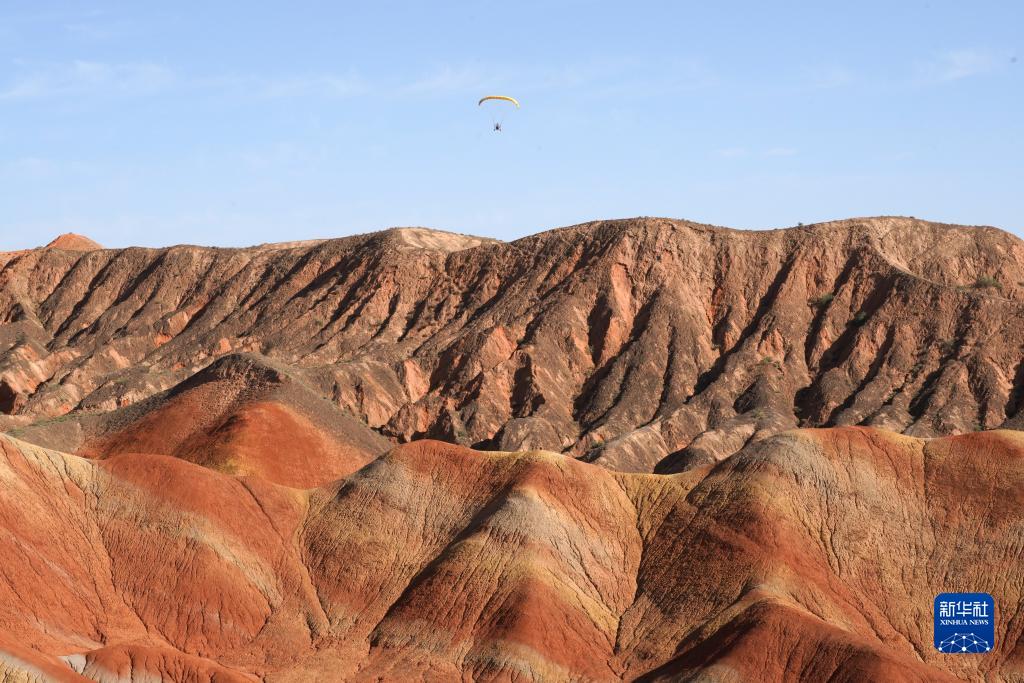 8月7日,游客乘坐动力伞游览张掖七彩丹乘坐霞景区。
