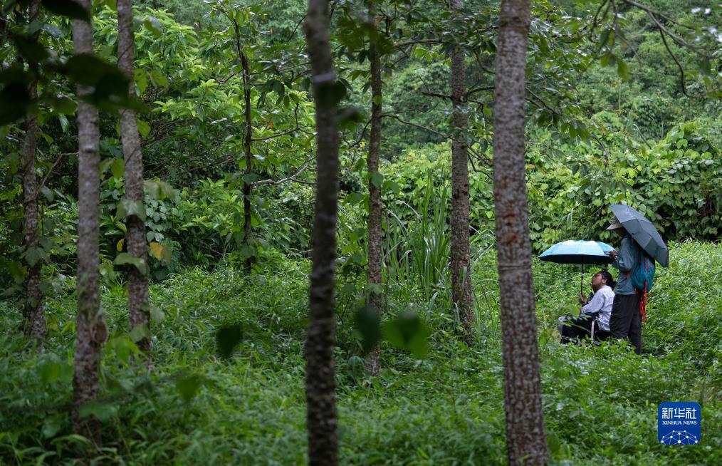8月5日傍晚,李文钦(右)和刘彦辰在雨中等待猴群回家。