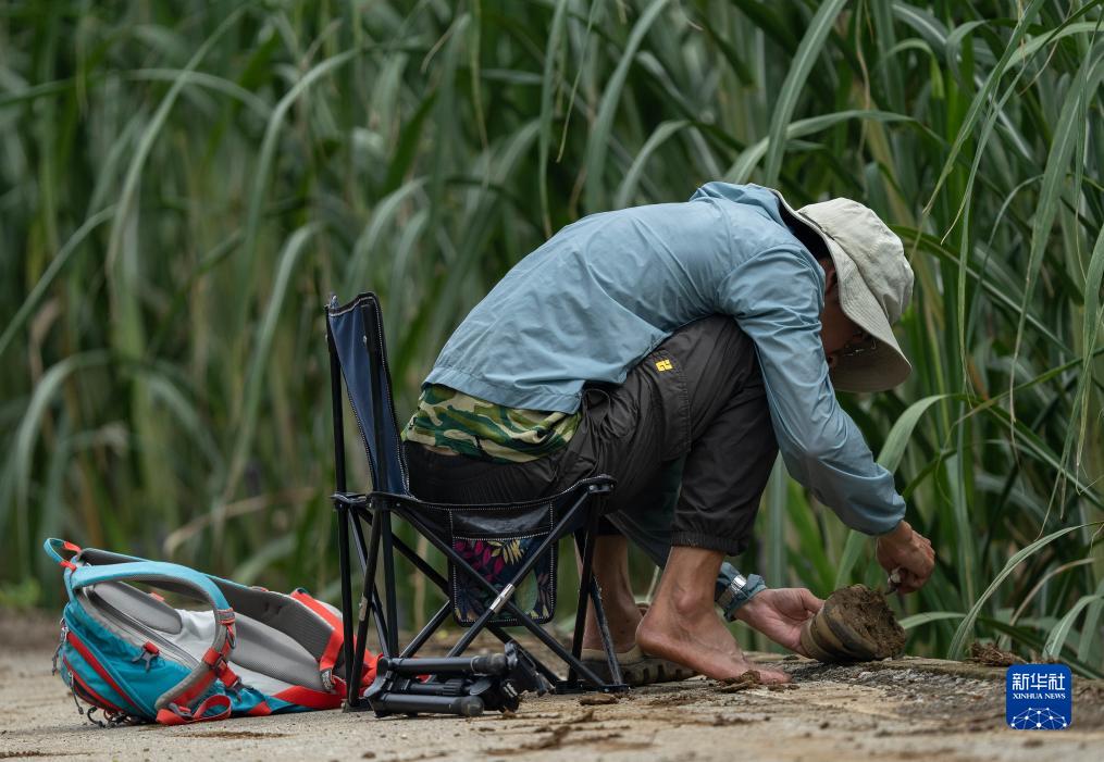 8月5日,李文钦从树林中出来后,清理沾在鞋上的泥巴。