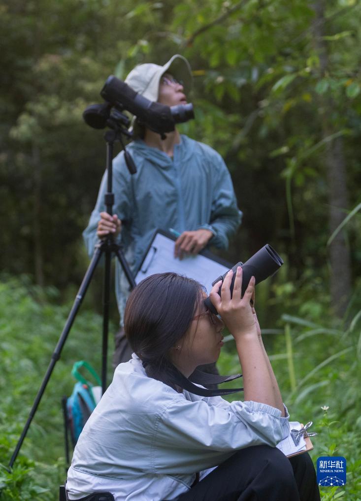 8月5日,李文钦(后)和刘彦辰在观察猴群。