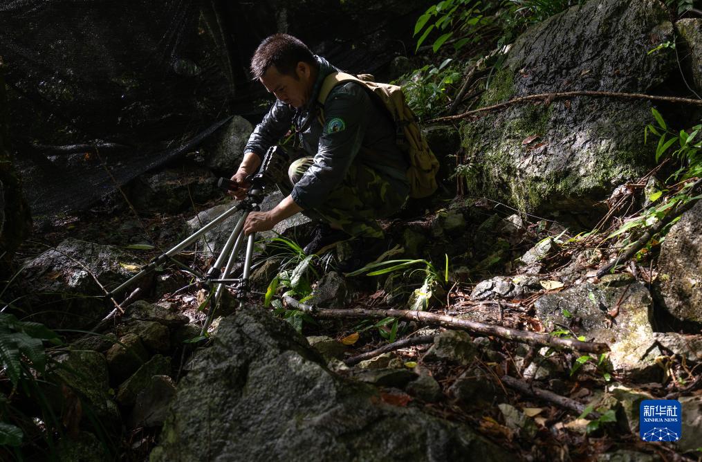 8月4日,梁志章在保护区巡视时,把被撞倒的红外线相机扶起来。