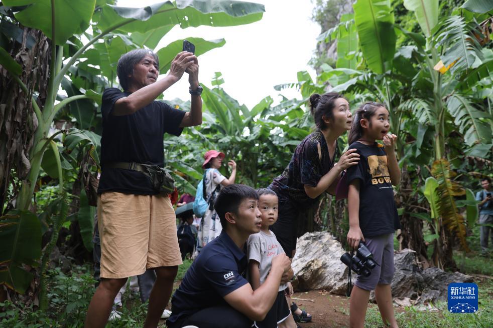 8月5日,游客在位于广西崇左的白头叶猴国家级自然保护区板利片区拍摄白头叶猴。