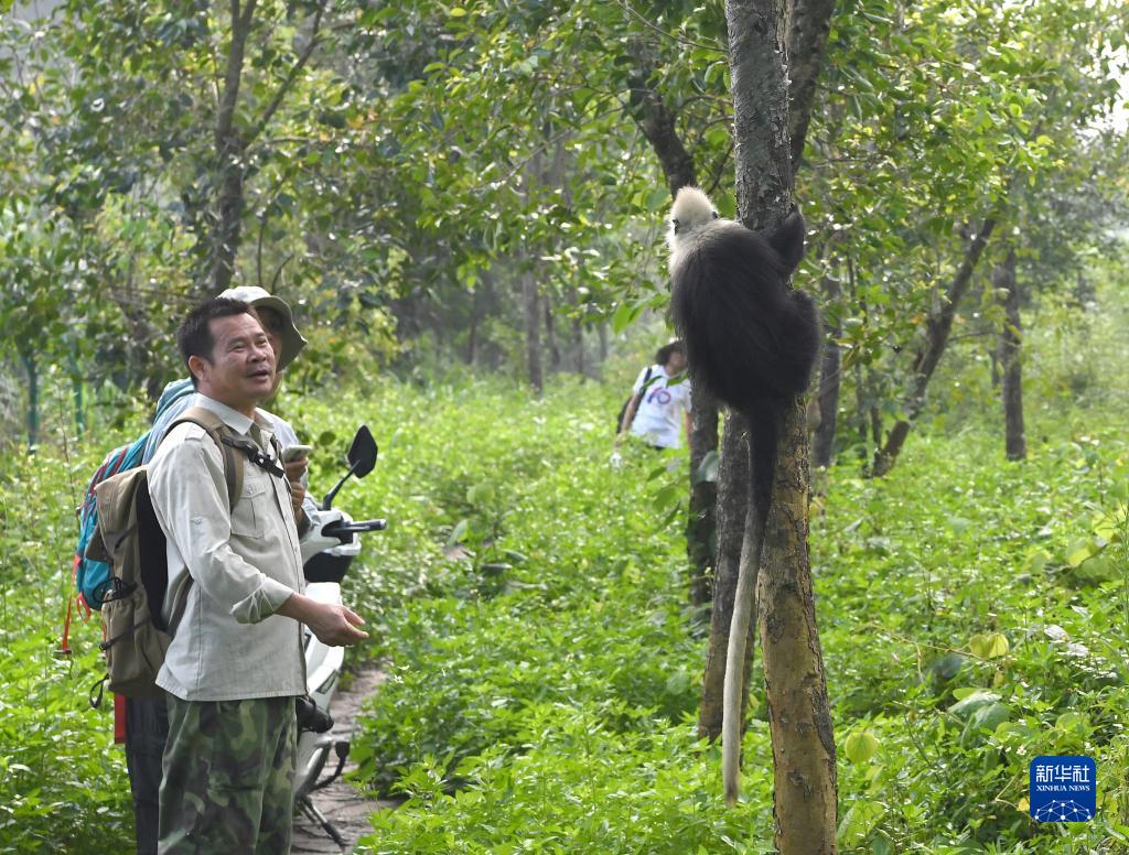 梁志章在近距离观察白头叶猴活动(8月5日摄)。