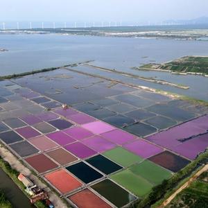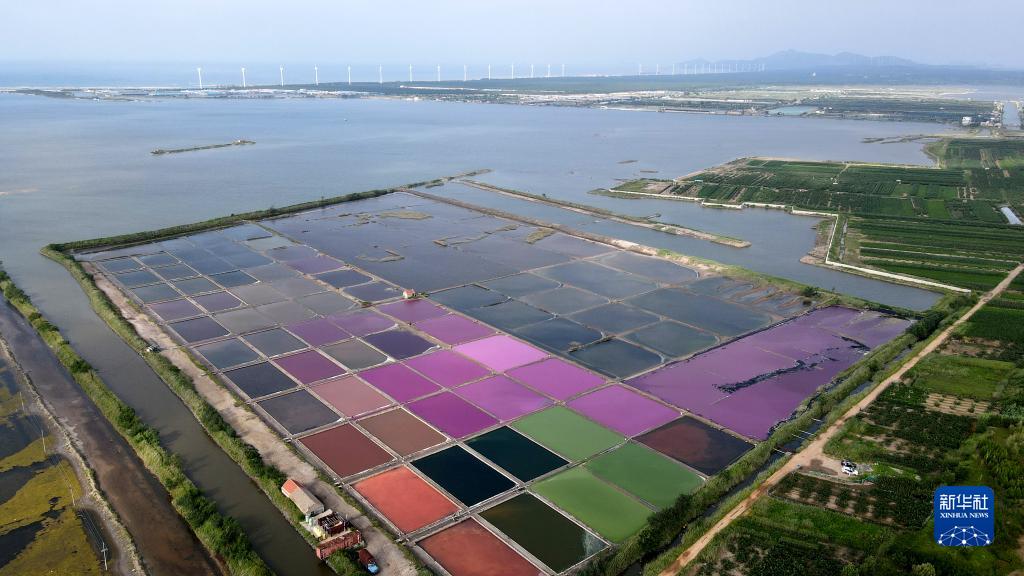 立秋将近,山东省荣成市港西镇海边的盐田在晴空的映衬下呈现出五颜六色的美丽景象。