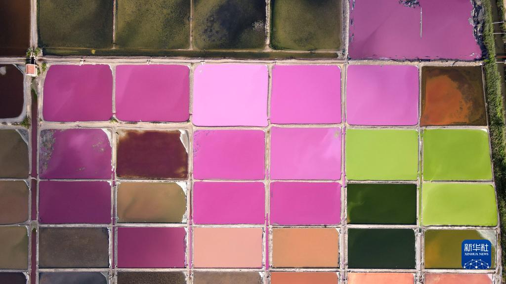 立秋将近,山东省荣成市港西镇海边的盐田在晴空的映衬下呈现出五颜六色的美丽景象。