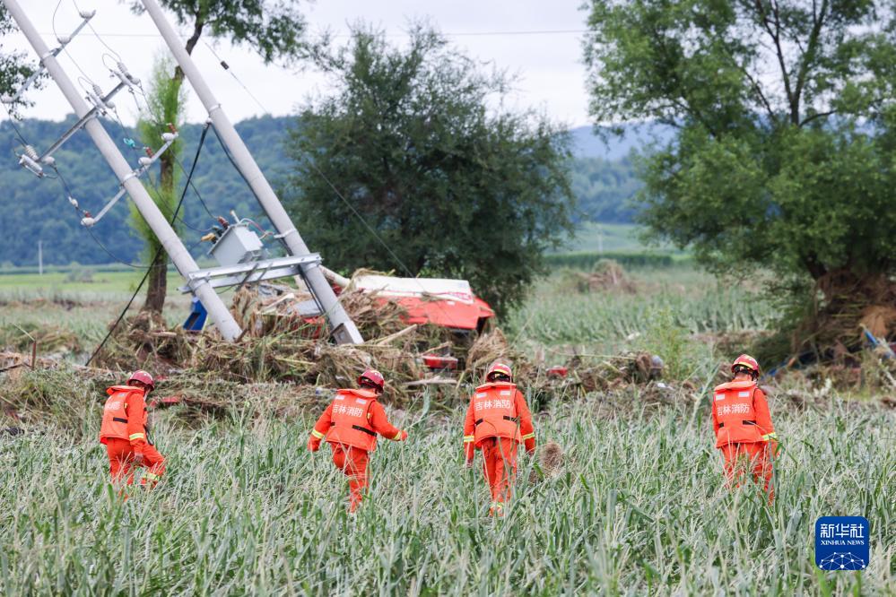 8月6日,吉林市消防救援支队的消防救援人员在舒兰市开原镇受灾村庄进行搜救。