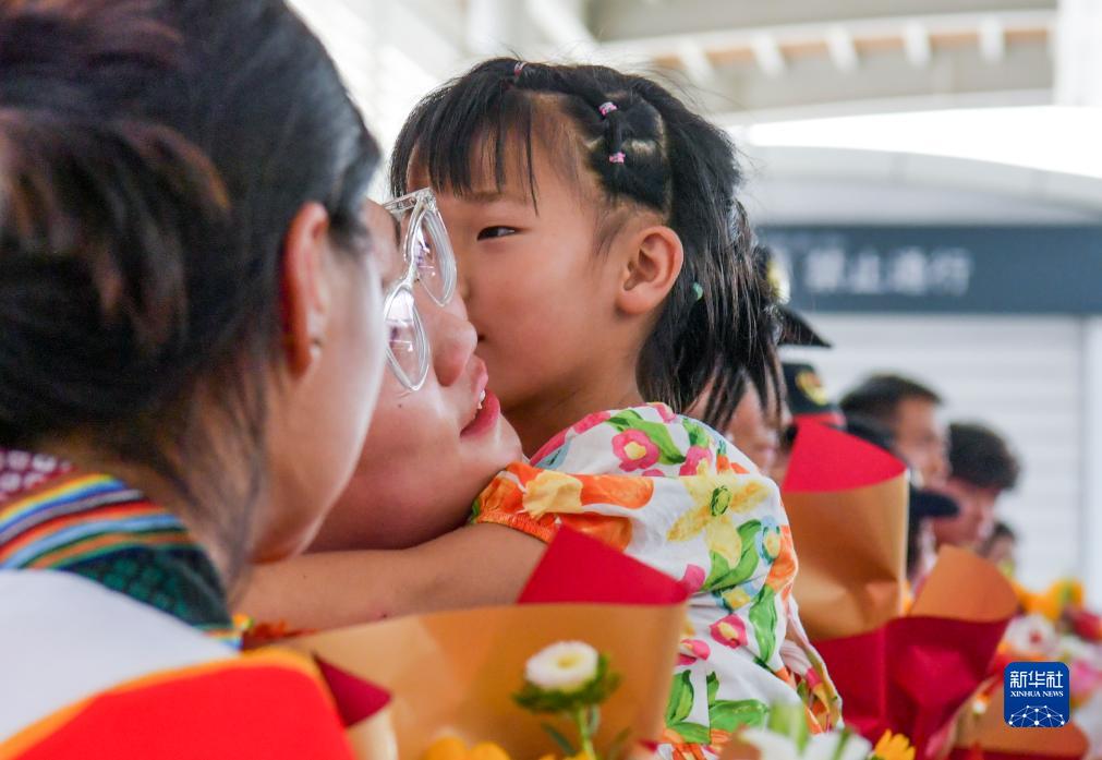 8月7日,在乌鲁木齐站,Z180次列车乘务人员家属迎接亲人归来。新华社记者 王菲 摄
