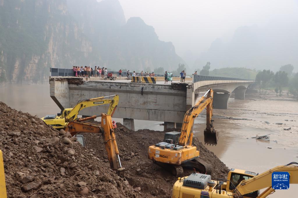 北京市房山区涞宝路四渡桥路基被洪水冲毁,桥面坍塌,中部战区陆军第82集团军某旅官兵抵达时,地方施工队伍在回填路基(8月3日摄)。新华社发(张康 摄)