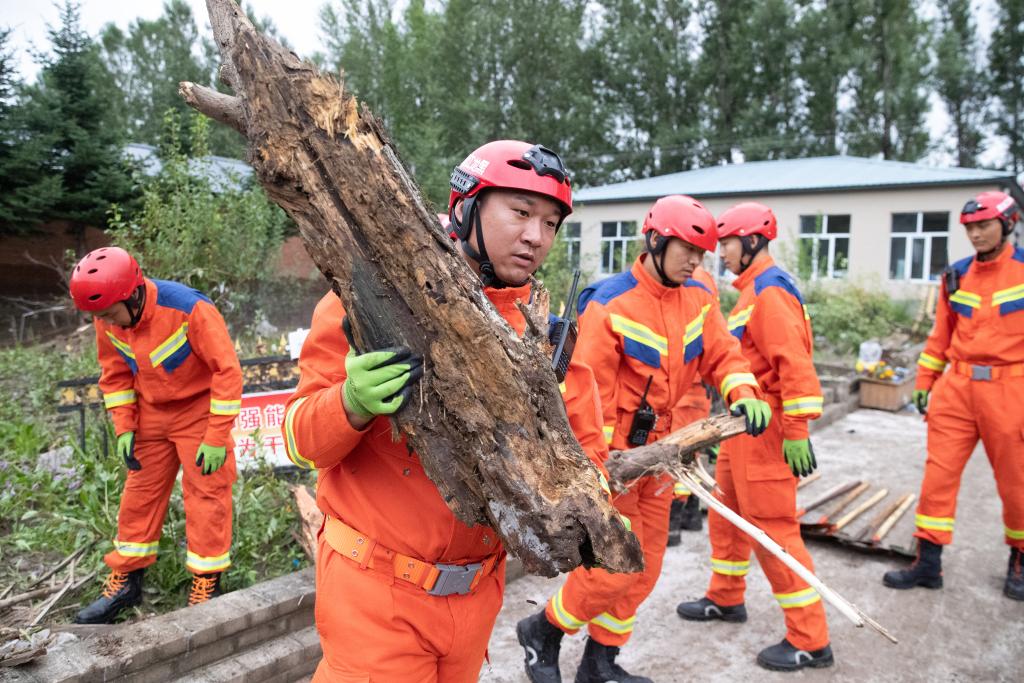 8月6日,在海林市长汀镇内,消防救援人员在清理院舍。新华社记者 张涛 摄