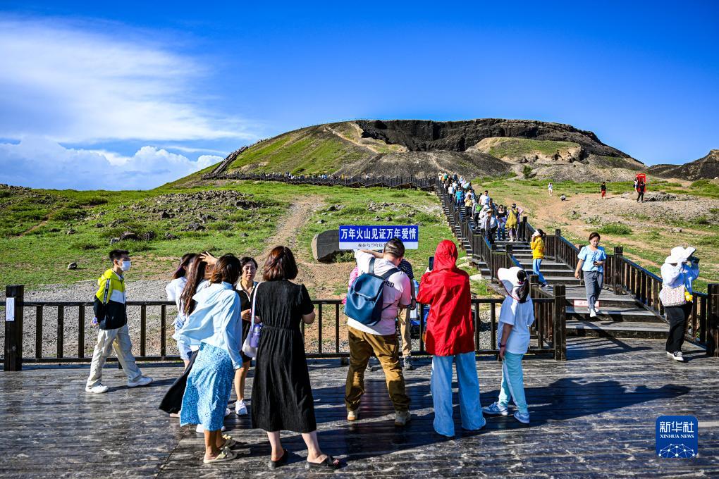 8月6日,游客在乌兰察布市察哈尔右翼后旗草原上的火山前合影留念。