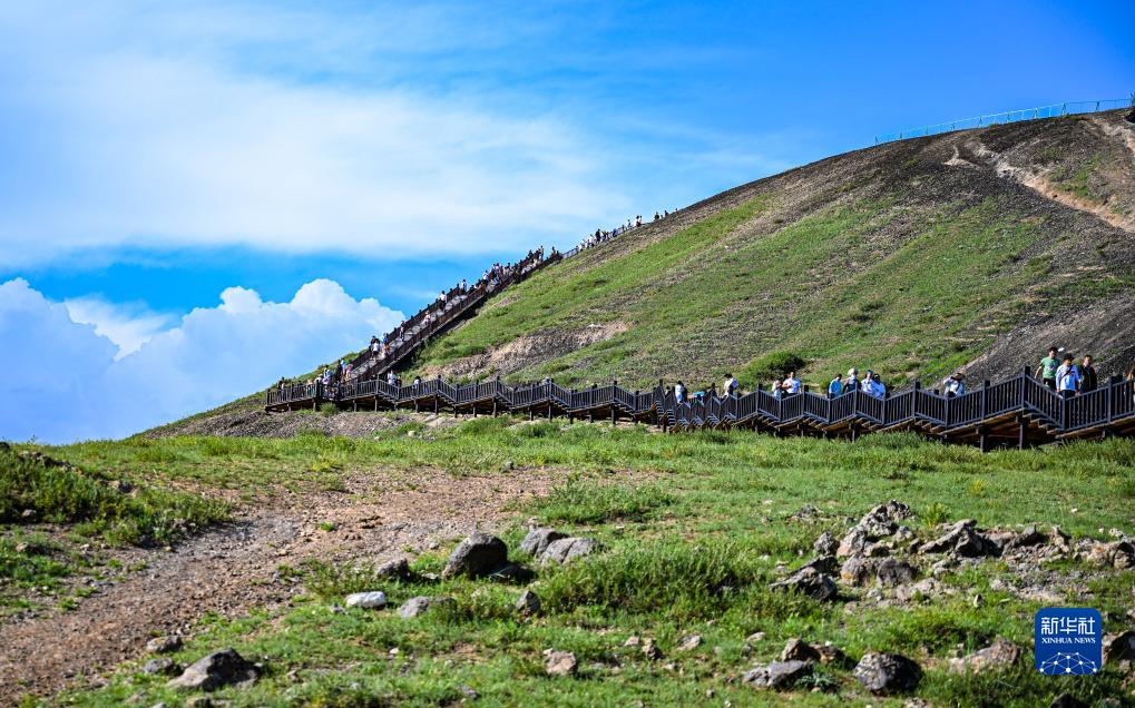 8月6日,游客在排队攀登乌兰察布市察哈尔右翼后旗草原上的火山。