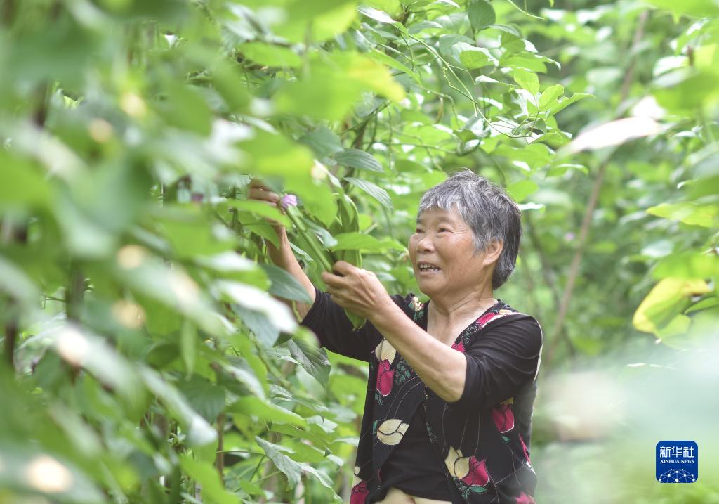 8月8日,在湖南省娄底市双峰县永丰街道白杉村,农民在采摘刀豆。
