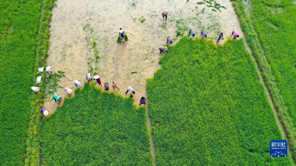 8月8日,在湖南省常宁市板桥镇樟塘村,农民在起晚稻秧苗(无人机照片)。