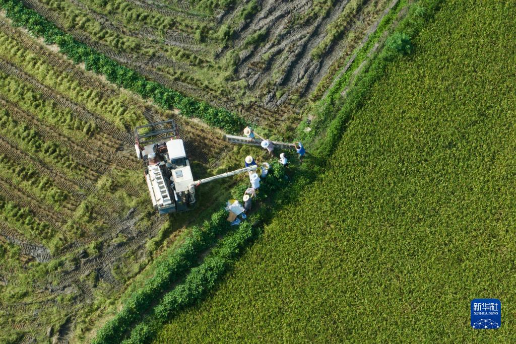 8月8日,收割机在重庆市北碚区三圣镇古佛村收割稻谷(无人机照片)。