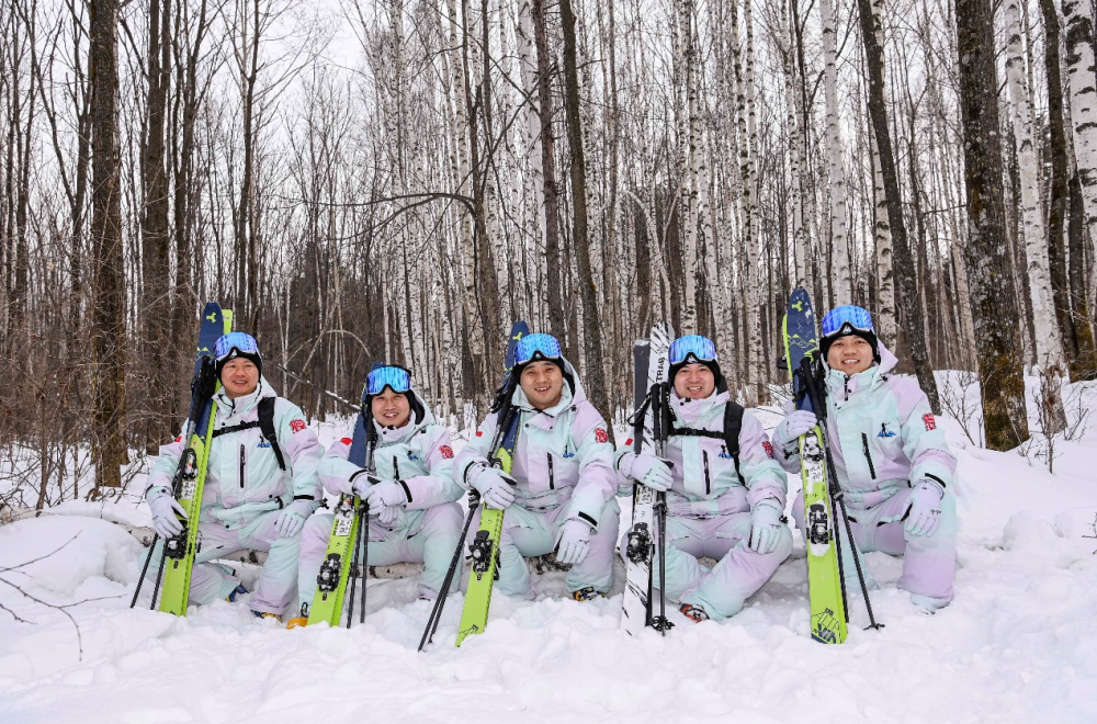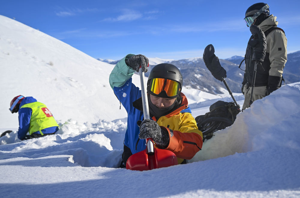 彭超(中)和新疆阿勒泰地区禾木吉克普林滑雪场救援队一起做雪层分析,预判风险保障游客滑行安全。