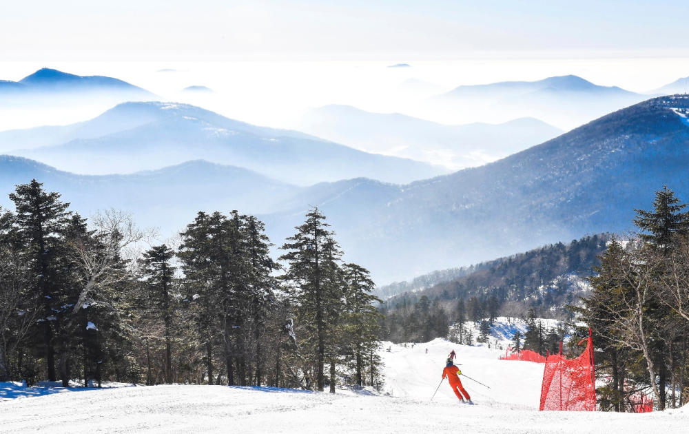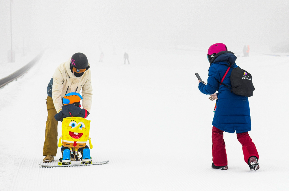 在新疆白云国际滑雪场,许秀娟(右)在给爱人和儿子拍照。哈尔滨人许秀娟曾是专业运动员,代表国家队拿过国际大赛奖牌。退役后她来到新疆,在这里她和爱人相识,一起开办培训机构,面向青少年推广冰雪运动。