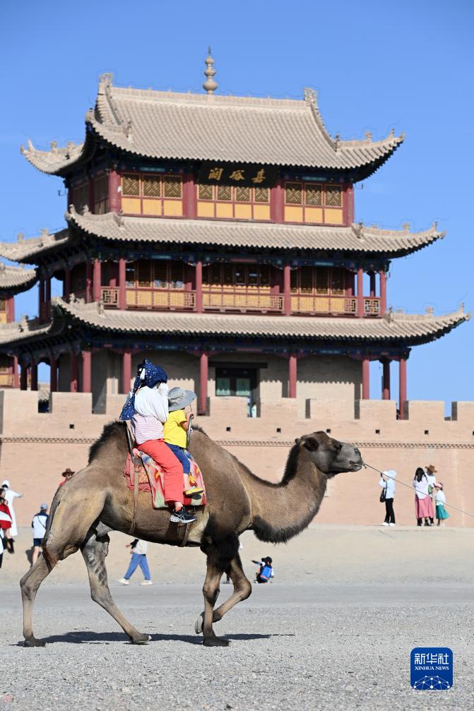 8月7日,游客在嘉峪关关城外骑骆驼。