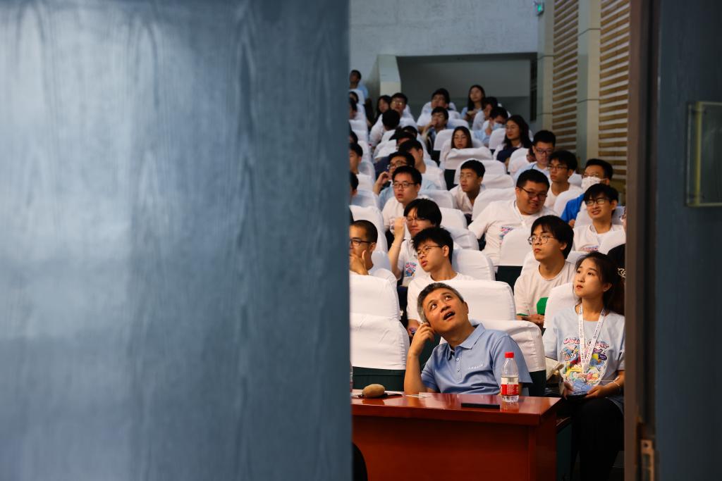 ↑7月21日,在位于安徽合肥的中国科学技术大学报告厅,彭承志准备给参加第十四届物理与化学夏令营微尺度分营的学生作报告。
