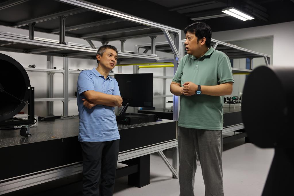 ↑7月21日,在位于安徽合肥的中国科学技术大学先进技术研究院,彭承志(左)与任继刚教授交流卫星地面站运行情况。
