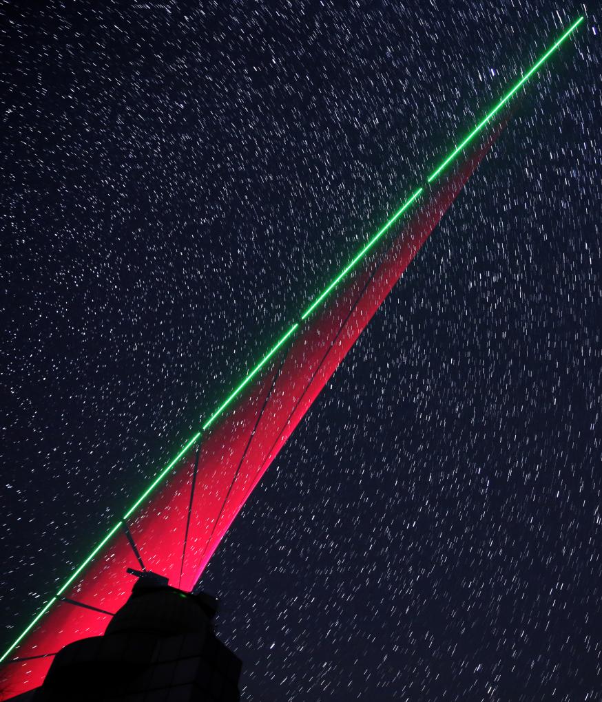 ↑“墨子号”量子科学实验卫星与阿里量子隐形传态实验平台建立天地链路(2016年12月9日摄,合成照片)。
