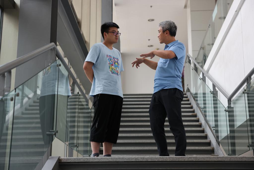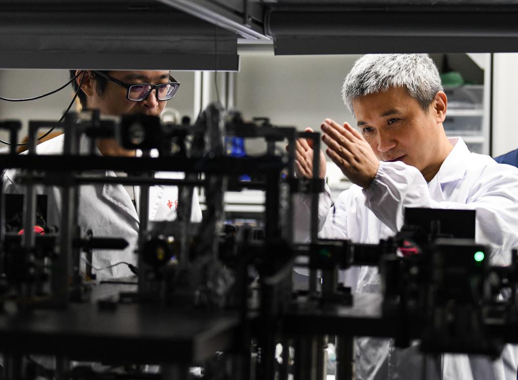 ↑7月21日,在位于安徽合肥的中国科学技术大学,彭承志(右)在实验室与学生交流实验进展。