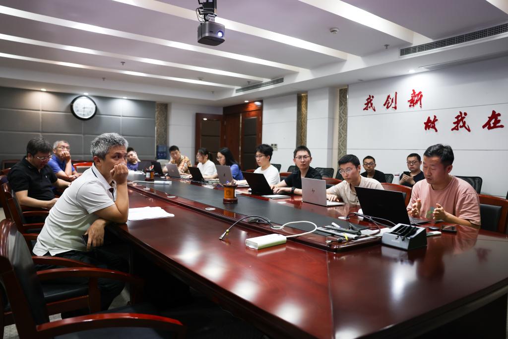 ↑7月22日,在中国科学技术大学上海研究院,彭承志(左)在参加组会时听取汇报。