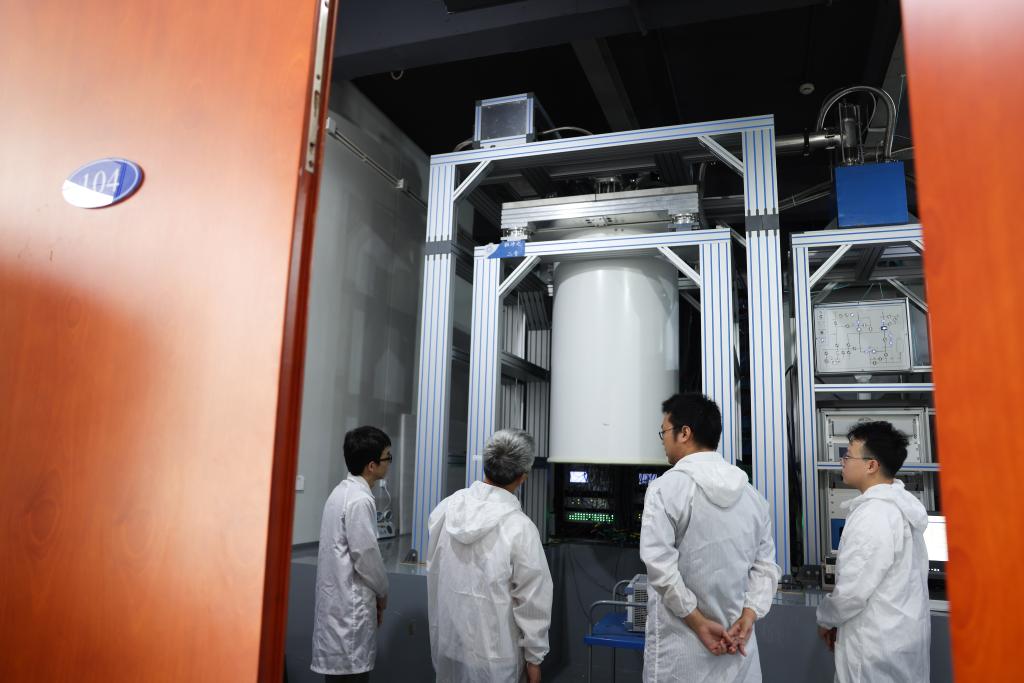 ↑在位于上海张江的上海量子科学研究中心,彭承志(左二)和团队成员在“祖冲之二号”前讨论研究进展(7月22日摄)。