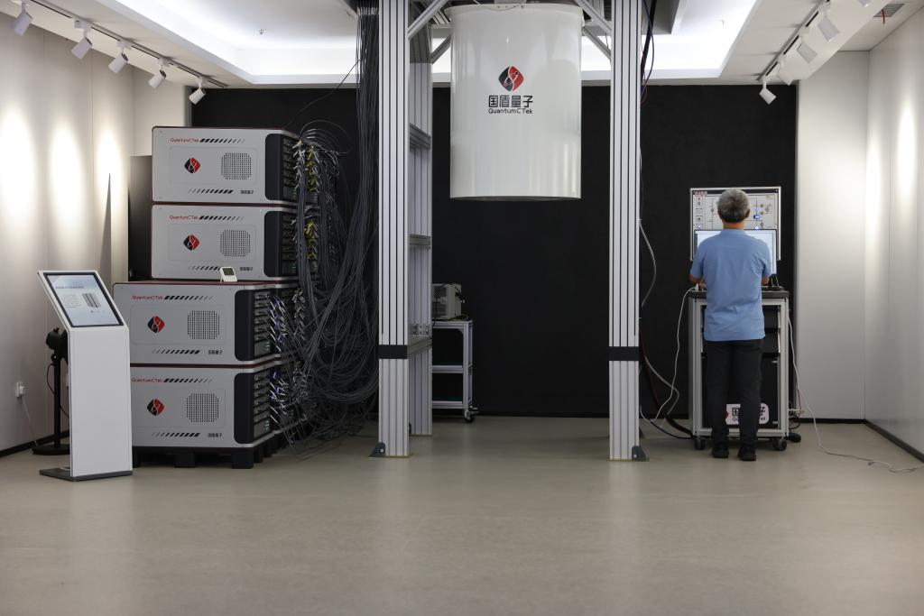 ↑位于合肥的国盾量子一楼展厅,彭承志在操作“祖冲之二号”(7月21日摄)。