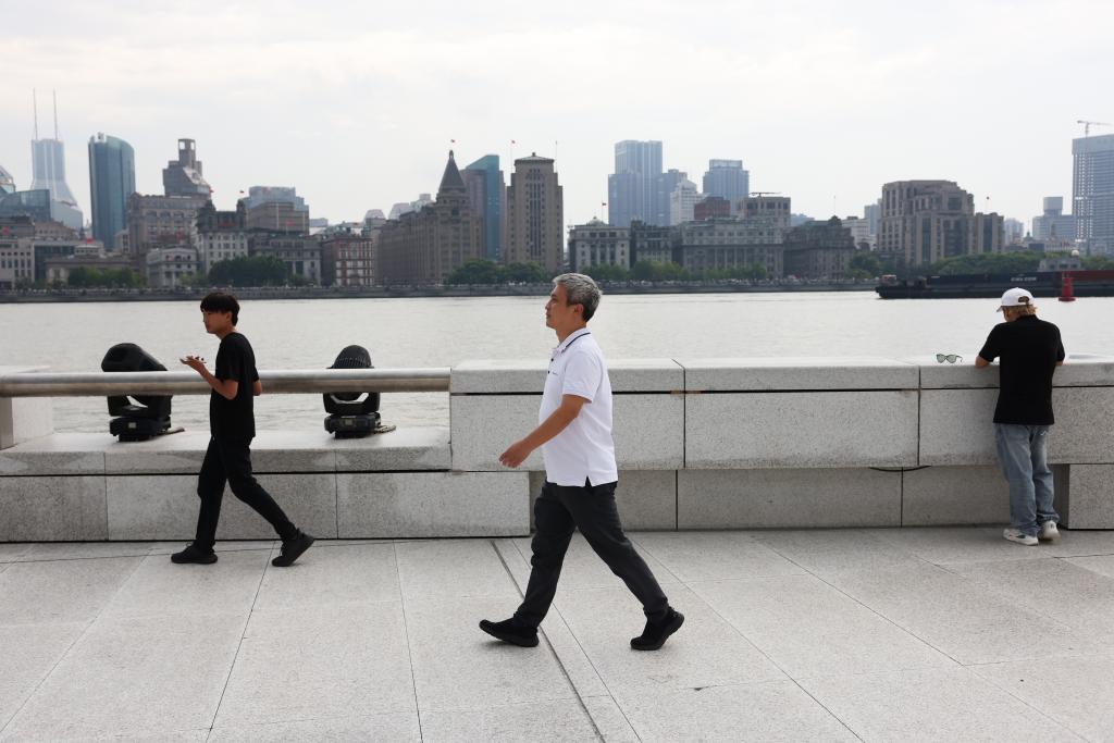 ↑彭承志行走在上海浦东滨江大道(7月22日摄)。