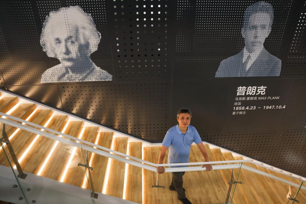 ↑彭承志在科大国盾量子技术有限公司楼梯前留影(7月22日摄)。