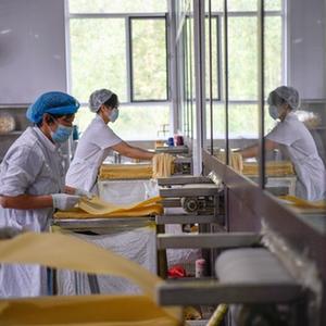 8月8日,在承德市双滦区西地镇一家豆片加工企业,工人在生产线上摆放豆片。