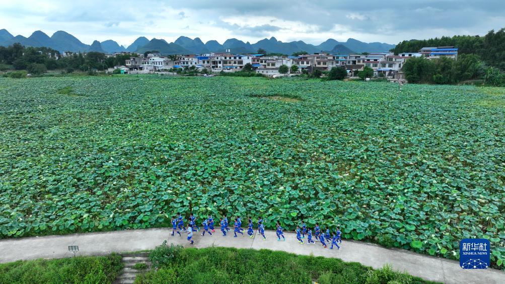 8月7日傍晚,孩子们在荷塘边跑步锻炼体能(无人机照片)。