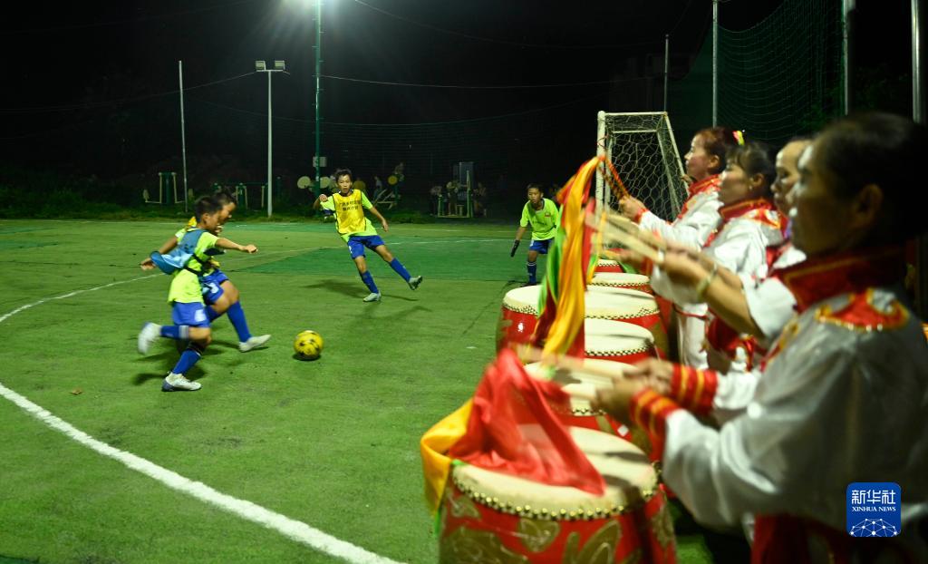 8月7日晚,村民敲锣打鼓为参加足球赛的孩子们加油助威。
