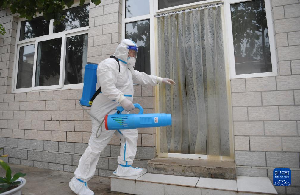 8月8日,工作人员在涿州市桃园街道忠义店村入户开展防疫消杀作业。