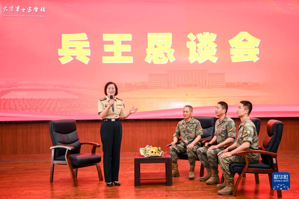 火箭军士官学校教授顾爱云(左一)组织举办兵王恳谈会(2023年6月10日摄)。新华社发(刘明松 摄)