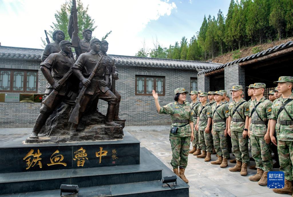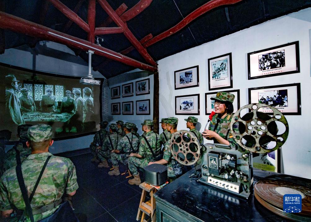 火箭军士官学校教授顾爱云(左一)在红色场馆给军士学员讲述革命先辈的战斗故事(2023年6月9日摄)。新华社发(刘明松 摄)