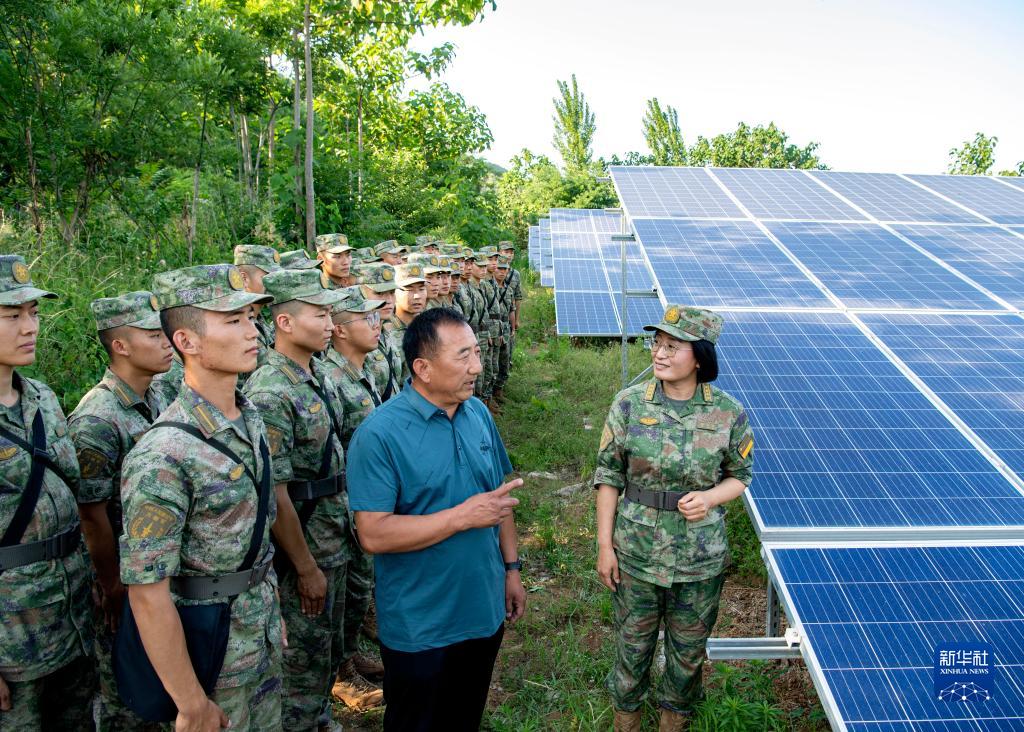 火箭军士官学校教授顾爱云(右一)带领军士学员参观光伏基地(2023年6月9日摄)。新华社发(刘明松 摄)