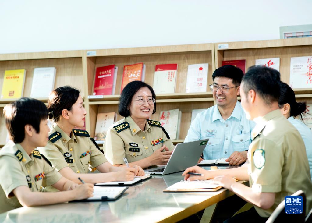 火箭军士官学校教授顾爱云(左三)给年轻教员分享教学心得(2023年6月8日摄)。新华社发(刘明松 摄)
