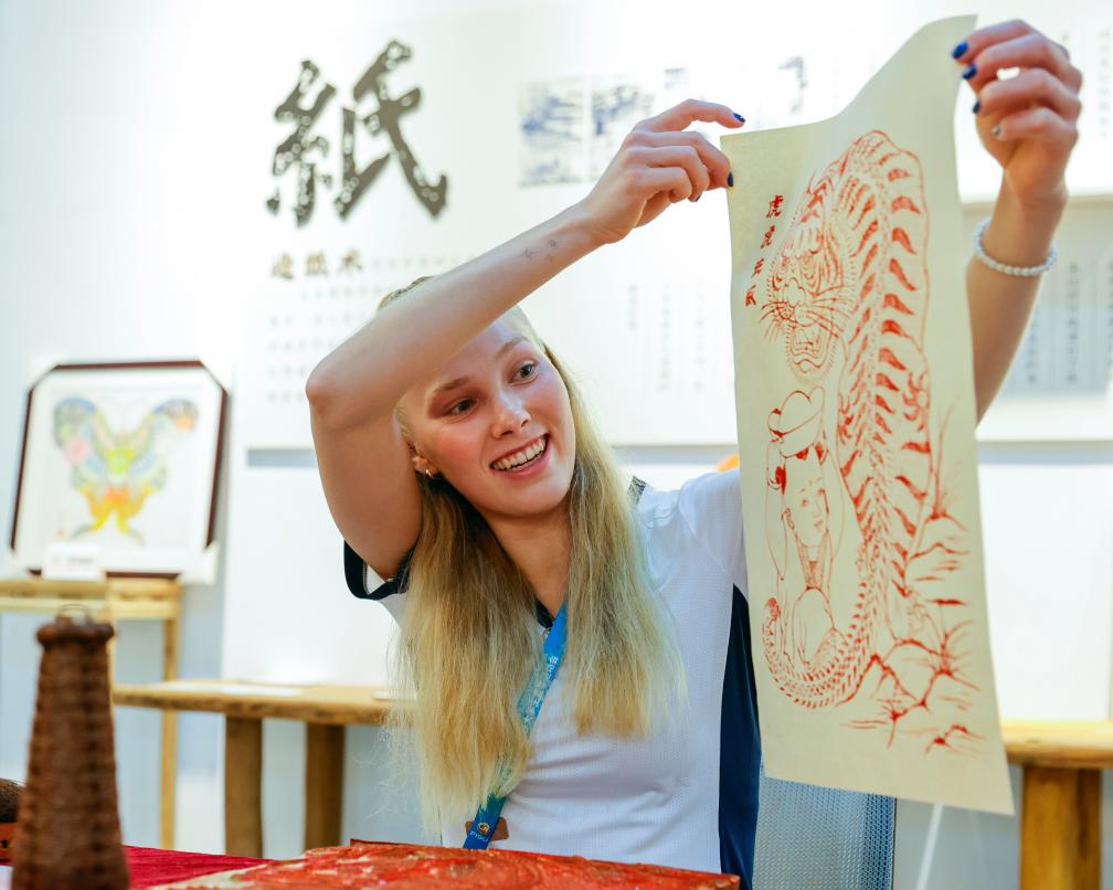 8月3日,在成都大运村的互动体验中心,芬兰运动员杰茜卡·卡哈拉展示自己制作的夹江年画。新华社记者 沈伯韩 摄