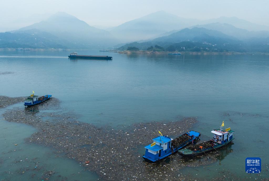 长江进入主汛期以来,秸杆、树枝、塑料等漂浮物随波逐流,聚集到三峡库区的江面上。三峡大坝上游的湖北省宜昌市秭归县环保部门组织清漂工人全力清漂,以减轻漂浮物对三峡枢纽运行的影响,确保三峡水库水质不受污染,保障船舶航行安全。
